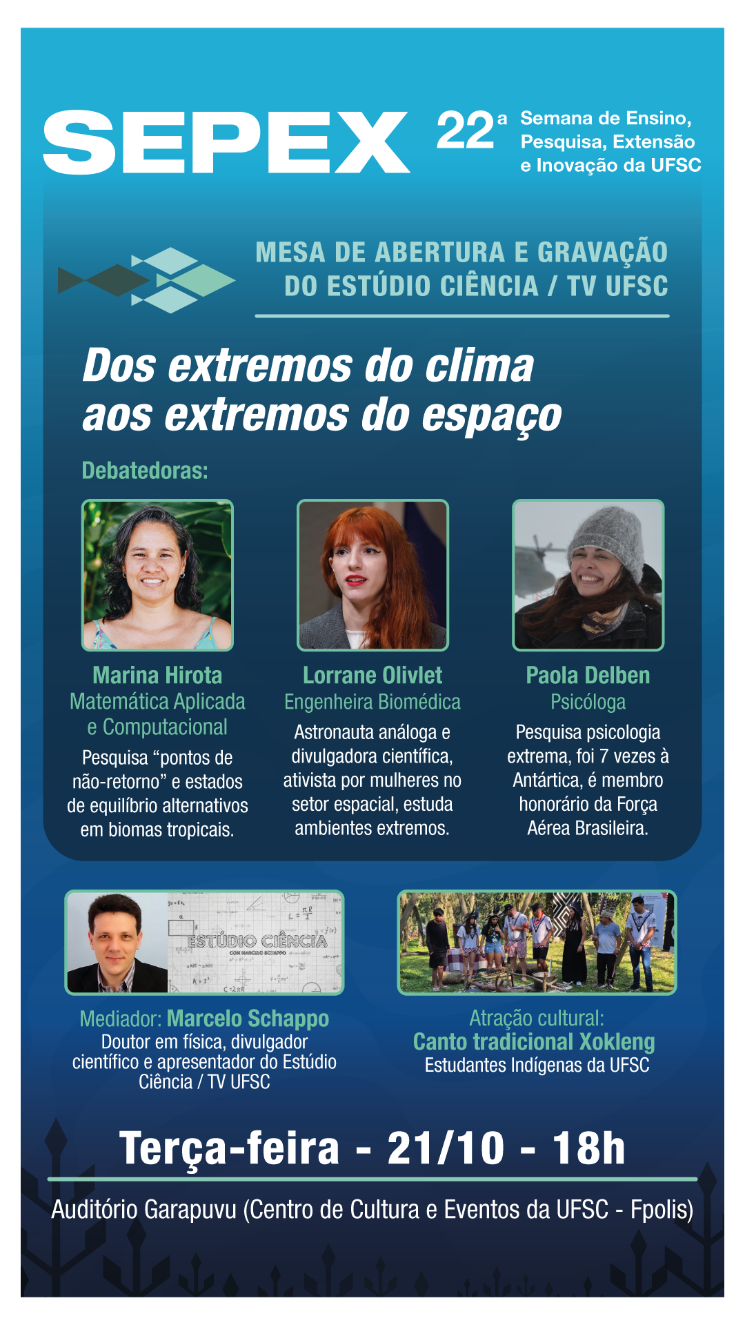 A mesa contará com a engenheira biomédica e influenciadora digital na temática espacial Lorrane Olivlet, que é astronauta análoga da Nasa, a agência espacial dos Estados Unidos; a professora da UFSC Marina Hirota, que pesquisa os chamados “pontos de não-retorno” das florestas tropicais e fatores de estresse que afetam a Floresta Amazônica; e a psicóloga Paola Delben, egressa da UFSC com atuação reconhecida na área de saúde mental em ambientes isolados, confinados e extremos (ICE).