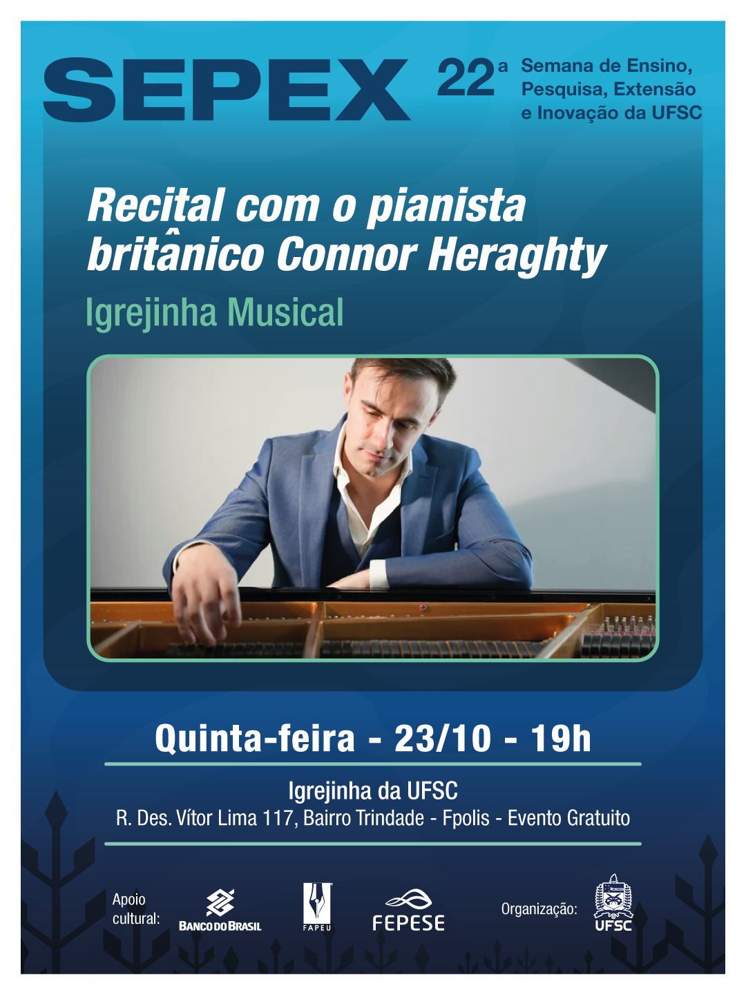 Show Pianista Connor Heraghty 16/10/2025 12:44 Calendar Adicionar ao calendário Adicione ao Calendário Timely Adicione ao Google Adicione ao Outlook Adicione ao calendário Apple Adicione a outro calendário Export to XML Quando: 23 de outubro de 2025@19:00 2025-10-23T19:00:00-03:00 2025-10-23T19:15:00-03:00 Onde: Igrejinha da UFSC UFSC Florianópolis - Bairro Trindade Custo Grátis Arte e cultura SEPEX